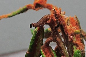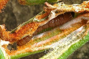 Kennel (1913: 388) teilte mit: "Die Raupe ist braunrot, der Kopf schwarz, das Nackenschild braun, hinten schwarz gerandet, die Analklappe braun; sie lebt im März und April an Ledum palustre, zwischen versponnenen Gipfelblättern, auch im Blütenstand und bohrt sich zur Verpuppung von da in den Stengel ein. "