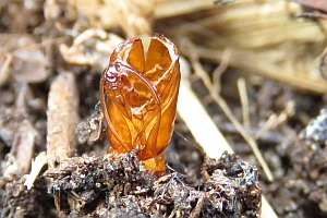 Kennel (1921: 576) formulierte zu "Epiblema brunnichiana Froelich": "Die Raupe ist in der Jugend weiß, erwachsen karminrot, swe Kopf braun, das Nackenschildchen blaßgelblich, die Analklappe von Körperfarbe, wenig ausgeprägt, manchmal aber auch braun; sie lebt in den Wurzeln von Tussilago farfara von September bis zum Frühjahr wo sie auch in die Blütenstengel aufsteigt."