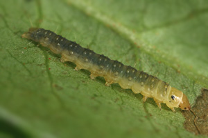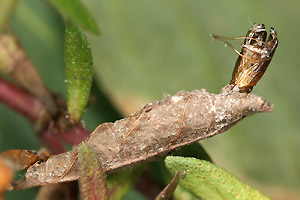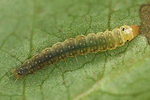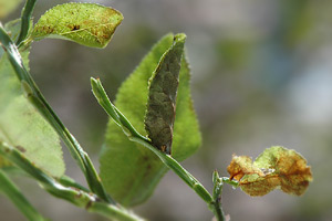 Die erwachsene Raupe faltet ein Blatt längs und verspinnt die Blattränder nach unten. Diese Blatttaschen erinnern an die Schoten eines Schmetterlingsblütlers. Im Innern wird die Blattepidermis aufgefressen und danach wird eine neue Blattasche gesponnnen. Eine Raupe benötigt für ihre Entwicklung nach meinen Beobachtungen 2-3 Blattgehäuse. Zur Überwinterung spinnt sich die Raupe eine weitere schotenförmige Blatttasche, von gleicher Art wie vorherigen, allerdings viel satter versponnen und kleiner. Die Innenseite wird selbstverständlich nicht mehr befressen. Zudem wird das Blatt manchmal lose mit dem Pflanzenzweig versponnen. Trotzdem fallen dann die meisten Hibernarien im Verlauf des Winters zu Boden.