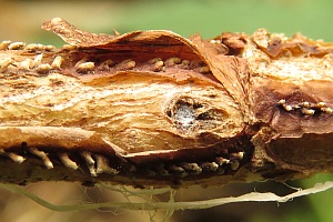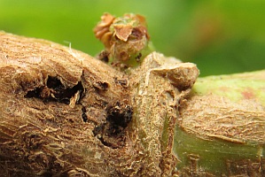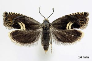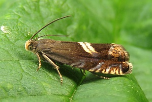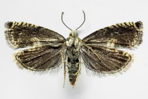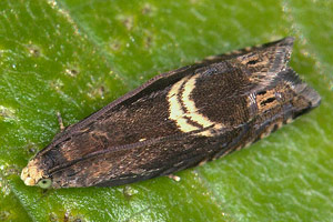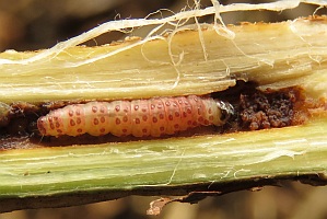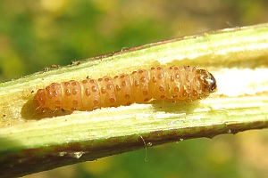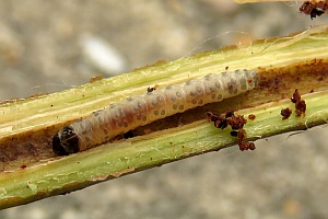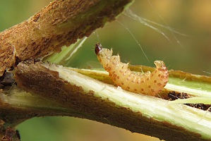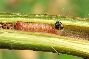 Kennel (1921: 673) schrieb dazu: "Die Raupe ist weißlich mit grauen Punkten, der Kopf braunschwarz, Nackenschild etwas heller. Analklappe klein, braun; sie lebt von August bis April in Hopfenstengeln nahe der Wurzel."