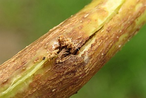 Schütze (1896: 12-13) konnte hier Neues berichten: "Umsomehr ist es zu verwundern, daß die Raupe bisher noch nicht bekannt war, wenigstens finde ich bezüglich derselben keinerlei Notizen, nicht einmal Vermuthungen. Ich habe sie im vergangenen Winter bei Rachlau entdeckt und zwar in den Ranken des wilden Hopfens, Humulus lupulus. Nachdem ich im Jahrgang 1895 dieser Zeitung den Aufsatz des Herrn Dr. Hinneberg über Graph. tetragrammnana [jetzt Grapholita delineana] und deren Raupe gelesen, beschloß ich sofort, letztere auch hier aufzusuchen. Bei flüchtigem Nachsehen Ende Sommers entdeckte ich mehrfache Fraßspuren in den Ranken, die Raupen hatten aber ohne Ausnahme die Wohnung verlassen, das Schlupfloch war deutlich zu sehen. Solche verlassene Fraßstellen fand ich auch bei längerem Nachforschen im Winter ziemlich zahlreich, weiß aber nicht, welche Raupen dieselben verursacht haben. Botys silacealis kann es nicht gewesen sein; denn abgesehen davon, daß diese Art bei Rachlau nicht vorkommt, obwohl wir Hopfen in Menge haben, waren auch die Fraßspuren viel zu klein; Raupen in ihren Wohnungen sah ich im Winter in Bautzen, wo sie ein Sammelfreund in Menge in Hopfenranken fand. Raupen von tetragrammana fand ich zwar bisher noch nicht, dafür aber andere von gleicher Größe, die mir schon im Februar den Falter ergaben: Grapholitha discretana Wk.". Nach einer längeren Beschreibung der Raupe wird die Suche näher beschrieben: "Die Raupe lebt während des Sommers im unteren Theile der Hopfenranken, vom Wurzelhalse aufwärts fressend und geht oft ziemlich hoch hinauf, jedoch ist meist nur der unterste Theil der Ranke dicht mit Exkrementen gefüllt. Im Spätherbste reinigt sie, meist im untersten Theil der Ranke, einen etwa 16 mm langen Theil ihrer Wohnung, spinnt ihn mit grauweißen Fäden aus und nagt ein Schlupfloch, aus welchem sich, nachdem die Raupe als solche überwintert hat, Ende Mai die Puppe zum größten Theil hervorschiebt, dem Falter die Freiheit gebend. Beim Suchen schneide ich die Ranke so tief wie möglich ab und spalte sie von unten an. Man findet sehr viele Fraßspuren, aber nur wenige Raupen, dagegen recht oft Schlupfwespenlarven, eine Art schon versponnen, eine andre noch als nackte Made."