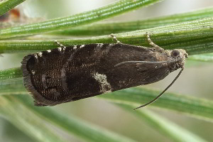 Aus England scheint nur Larix decidua als Raupennahrung bekant zu sein, den Hancock et al. (2015: 186-187) schreiben: "Ovum. Laid in May - June on the young cones of European larch (Larix decidua); on the Continent also on Norway spruce (Picea abies), silver-fir (Abies alba) and Douglas fir (Pseudotsuga menziesii) (Swatschek, 1958, Patočka, 1960)." Und weiter zur Raupe: "July - April; feeding on the seeds in the developing cones; the only British rearing record appears to be from larch cones collected in early August 1988 from Tubney Wood, near Oxford".