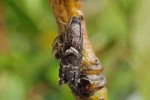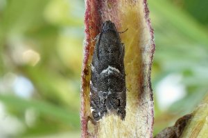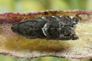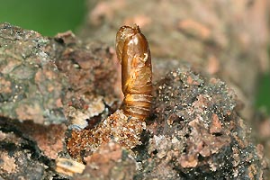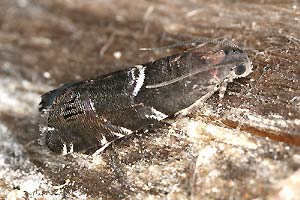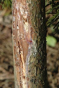 Der Wickler, Cydia coniferana, ist weniger spezialisiert als der Tannenglasflügler. Er entwickelt sich in unterschiedlichen Stammverletzungen verschiedener Koniferen. So hat Peter Sonderegger die Raupen an den harzenden Stellen bei Verletzungen an den Stämmen junger Kiefern (Pinus sylvestris) gefunden. Diese Verletzungen rühren von Forstarbeiten her oder werden durch das Wetzen mit den Geweihen von Rotwild erzeugt. Im Bild das Stämmchen einer jungen Waldföhre mit den durch das Geweih eines Rehs oder Hirschs hervorgerufenen Kratzspuren, die jetzt mit Raupen besetzt sind, wie der Bohrmehlauswurf zeigt. Bei anderer Gelegenheit sind daraus die Falter von Cydia cosmophorana geschlüpft. Diesmal waren es bisher jene von Cydia coniferana [Rudolf Bryner].