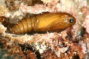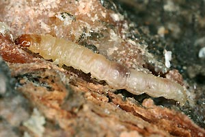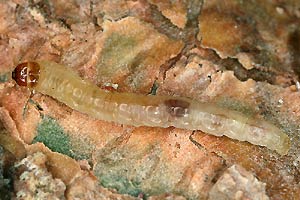 Kennel (1921: 671) trug zusammen: "Die Raupe ist weißlich, der Kopf hellbraun, Nackenschild noch heller, schmal, die Analklappe kaum angedeutet; sie lebt von September bis in den Mai in harzigen Stellen von Kiefern und Tannen (dem durch Aecidium elatinum erzeugten "Tannenkrebs")."