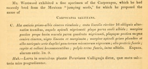 Erst einmal entdeckt waren Mexikanische Springbohnen bald der Renner. H. Lucas berichtete in der Sitzung der Académie des Sciences de Paris vom 5. April 1858 von diesem Phänomen der "springenden Bohnen", J.O. Westwood in der Sitzung vom 7. Juni 1858 der Entomological Society of London. H. Lucas hatte seine Tiere Carpocapsa deshaysiana genannt, J.O. Westwood sprach von Carpocapsa saltitans. Weil der Bericht von H. Lucas früher zwei Monate früher vorgetragen wurde, wurde in der Folge der von ihm gewählte Namen verwendet - allerdings durchgehend (und mir völlig unverständlich!) zu "Carpocapsa deshaisiana" abgewandelt. Erst 2020 stellten dann Gilligan et al. (2020: 46) in einer ausführlichen Diskussion klar, dass die Arbeit von Lucas (1858) nur ein nomen nudum im Sinne des ICZN beschrieb und dass seine Arbeit sowieso wahrscheinlich erst zeitlich nach derjenigen von Westwood (1858) erschien, Westwoods Name also Gültigkeit hat. Tatsächlich beschrieb Lucas (1858) in seinem ausführlichen Aufsatz immer nur die Spuren und das Verhalten der Raupe, nirgends aber auch nur ansatzweise den Falter. Westwood (1858) hingegen begann mit einer lateinischen Diagnose des Falters und ging erst danach auf das wundersame Verhalten der Raupen ein.