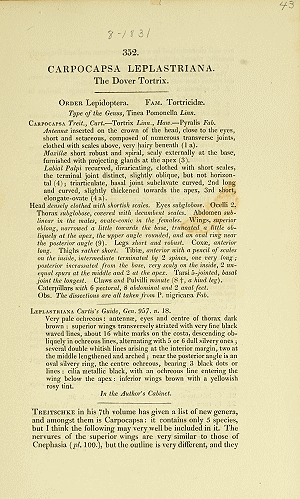 - Erstbeschreibung: Curtis, J. (1823-1840): British Entomology; Being Illustrations and Descriptions of the Genera of Insects Found in Great Britain and Ireland: Containing Coloured Figures from Nature of the Most Rare and Beautiful Species, and in Many Instances of the Plants upon which they are Found. Vol VI. Lepidoptera, Part II. — [Not paginated]. London (E. Ellis & Co.).