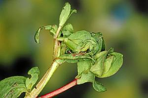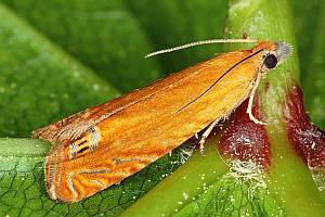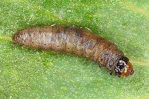Nach Razowski (2001) fressen die Raupen zwischen versponnenen Blättern, selten auch Blüten oder Samen von Johanniskraut-Arten, namentlich Hypericum perforatum und Hypericum hirsutum. Insgesamt werden in der Literatur diese beiden Arten immer wieder einmal wiederholt, meist aber heißt es einfach "Hypericum spec." Ich selbst kenne die Raupen aus Südwestdeutschland von Hypericum perforatum, Hypericum maculatum und Hypericum x desetangsii. Tina Schulz zeigt oben Raupen an Hypericum hirsutum. Ich gehe davon aus, dass noch weitere Arten der Gattung genutzt werden, möglicherweise aber tatsächlich nicht alle. So fällt auf, dass die Art gar nicht als "Schädling" gilt, obwohl doch das Großblütige Johanniskraut (Hypericum calycinum) sehr häufig in Parks und Grüninseln an Straßen gepflanzt wird. Bei Eiablage-/Fütterungs-Versuchen in Neuseeland (Hill 2019) wurde festgestellt, dass das aus Europa eingeschleppte und als Zielart zur Bekämpfung vorgesehene Blut-Johanniskraut (Hypericum androsaemum) besonders gut belegt und befressen wird; Hypericum perforatum etwas weniger, das eben erwähnte Hypericum calycinum wurde seltener belegt und die Larvalentwicklung dort nicht erfolgreich abgeschlossen - und die 4 einheimischen Arten der Gattung wurden weder belegt noch befressen.