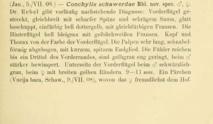 - Erstbeschreibung: Schawerda, K. [Vors.] (1908): Bericht der Sektion für Lepidopterologie. Versammlung am 6. November 1908. — Verhandlungen der kaiserlich-königlichen zoologisch-botanischen Gesellschaft in Wien 58: (250)-(273).