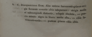 Nedoshivina (2007: 100): “Types. Lectotype ♂ (here designated) (Fig. 25): ‘Spask’ <handwritten>, ‘195b’ <hand-written>, ‘praep. | micr. | N 7749 | Eux. discopunctana Ev. ♂ | Cotypus. Spask’ <white, printed>, ‘Praep. micr. N 0040 | Cochylimorpha discopunctana | (Eversmann, 1844) | S. Nedoshivina det., 2006’ <white, printed>, ‘LECTOTYPUS. | Cochylis discopunctana Ev., 1844. | S. Nedoshivina design. 2007’ <red, printed>. – Paralectotypes: 1 ♂, 1 ♀ and 1 specimen without abdomen from Spassk (‘Spask’).”