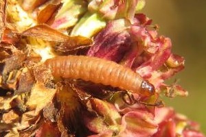 Schon Kennel (1913: 269) hatte geschrieben: "Die Raupe ist rotbräunlich, der Kopf, das Halsschild und die Analklappe sind dunkelbraun; sie lebt im August und September in den Blüten- und Samenköpfen von Sanguisorba officinalis und verpuppt sich außerhalb der Wohnung."