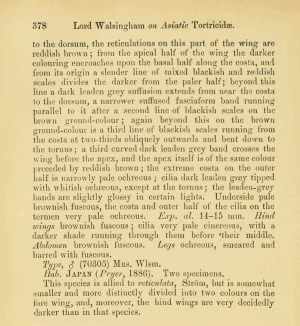 - Erstbeschreibung: Walsingham (1900): Asiatic Tortricidae. — The Annals and Magazine of Natural History, Including Zoology, Botany, and Geology. Seventh series 5: 368-386, 451-469. London (Taylor and Francis).