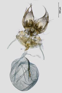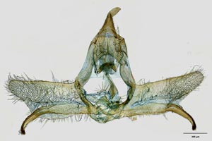 Hinweis: auch Cnephasia asseclana kann einen langen Sacculus zeigen; dieser ist aber weniger gebogen. - Ergänzung: Tina Schulz nach [British Lepidoptera]