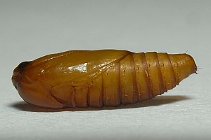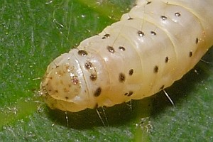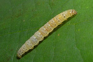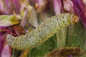 Die Raupe scheint recht polyphag zu sein, lebt aber bevorzugt an Asteraceen-Blüten (oder wird dort gerne gefunden). Schütze (1931: 185) konnte berichten: "Diese Art, die nur von Kent aus England bekannt gewesen ist, fand ich im Sommer 1928 auf der schwedischen Insel Oeland. Auch die Raupe, die ganz unbekannt gewesen ist, fand ich dort in Menge. Sie lebt in der geöffneten Blüte von Hieracium und Chrysanthemum [was war gemeint ? Chrysanthemum?, Leucanthemum? oder Tanacetum?] während des Monats Juni. Die Randblüten des Blumenkorbes werden über den Kopf hineingebogen, und unter ihnen verbirgt sich die Raupe, die von den Scheibenblüten und Früchten frisst."
