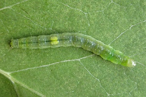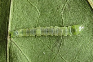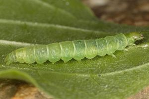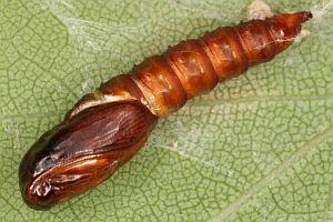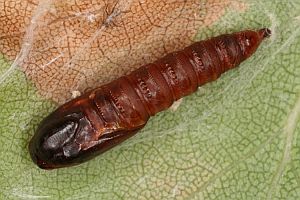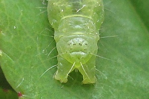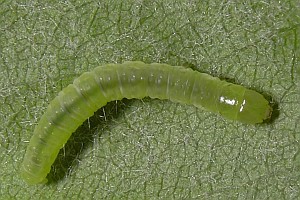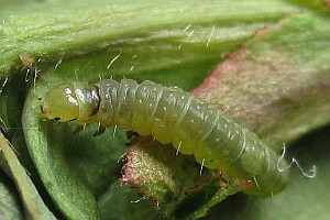 Kennel (1910: 159) sammelte zusammen: "Die Raupe ist grün mit dunkler Dorsallinie, der Kopf und das Nackenschild bräunlich oder grünlich, die Wärzchen sind weiß. Sie lebt im Mai bis Juni, in zweiter Generation im Juli in Blattrollen von Rhamnus frangula, Prunus spinosa, Quercus, Sorbus, Betula, Vaccinium myrtillus, Salix caprea, Tilia, Ulmus, Fraxinus, Lysimachia vulgaris, Humulus, Anchusa etc."
