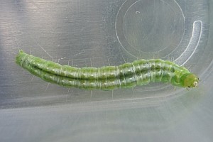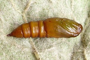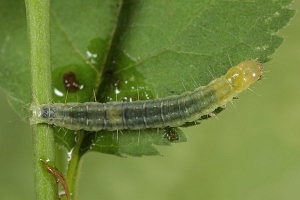 Kennel (1910: 194) trug zusammen: "Die Raupe ist grün, die Dorsal-, Subdorsal- und Laterallinien sind dunkler grün, ebenso Kopf und Nackenschild. Sie lebt im Mai und Juni, auch noch Anfang Juli in Blattrollen oder versponnenen Blüten an Lonicera periclymenum, Valeriana officinalis, Urtica, Sanguisorba, Origanum, Dictamnus albus, Hedera, Thalyctrum angustifolium, Rubus caesius, Umbelliferen; auch Quercus."