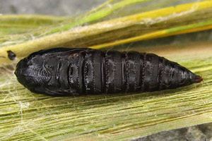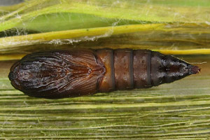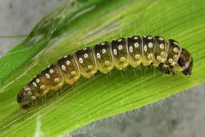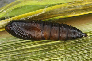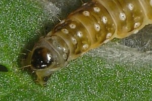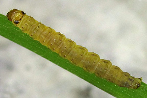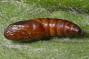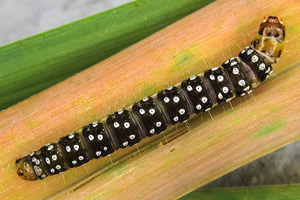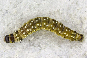 Kennel (1910: 181) trug zusammen: "Die Raupe ist schwarz mit weißen Wärzchen, Kopf braungelb, schwarz gesäumt, Nackenschild schwarz. Sie lebt im Mai bis Anfang Juni in einem Blattgespinst an niederen Pflanzen wie Scabiosa, Inula, Rhinanthus, Caltha, Conyza, Petasites albus und niveus, Cirsium, Luzula albida, auch an Lonicera; Quercus wird gleichfalls angegeben."