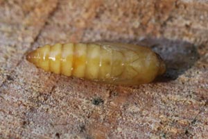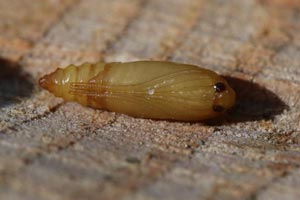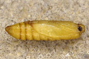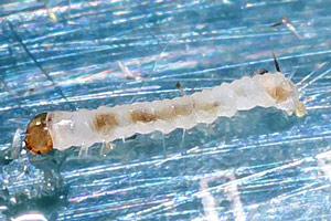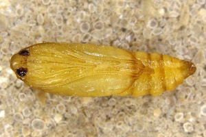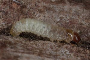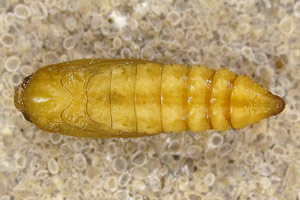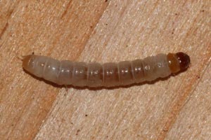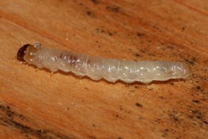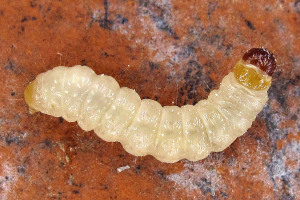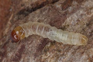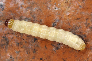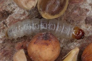 Schütze (1931) fasst zur Raupe zusammen: "In Niederlagen an Mehlfrüchten, Erbsen, Reis, von dem sie sechs bis acht Körner zu einem Klumpen verspinnt (Sorhagen). An verschiedenen Sämereien und Erbsen, die sie ganz aushöhlt, ebenso fand ich sie in einem Herbarium, die Pflanzen verwüstend, desgleichen in alten Hundekuchen (Disqué).