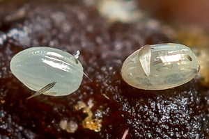 Disqué (1895) liefert einen typischen Bericht: "[...] fand ich im November 1883 in dem Herbarium des Besitzers einer Samenhandlung, welches sie gänzlich zerstört hatte. Auch im Samenmagazin war sie zahlreich an trockenen Erbsen und sonstigen Sämereien in Gemeinschaft mit der Raupe von Endrosis lacteella. Beide Raupen ähneln sich sehr. Sie sind weißlich mit kastanienbraunem Kopf und gelbbraunem Nackenschild. Die der lacteella hat das Afterschild angedeutet, was bei pseudospretella nicht der Fall ist. Als einige Jahre später die Samenbehälter einmal gründlich gereinigt wurden, verschwand pseudospretella vollständig."
