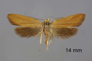 1: ♀, Schweiz, Bern, Ins, 430 m, 15. März 2014, Raupe in Porlingen, e. l. 13. Mai 2014 (leg., cult., det. & Foto: Rudolf Bryner)