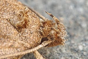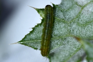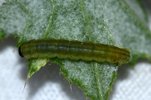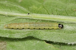 Bei Schuetze (1937) heißt es dann: "An Cirsium lanceolatum und Cirsium acaule, Sarothamnus, Onopordon, Centaurea jacea, Centaurea cyanus an der Blattunterseite neben der Mittelrippe in einem Gewebe; die Oberhaut bekommt gelbe Flecken." Die Angabe zum Besenginster ist dabei sicher grob falsch. Nutzung von Centaurea jacea wird durch die oben gezeigte Raupe aus England auch aktuell bestätigt.