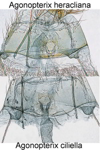 Der Abstand des Ostiums vom unteren (proximalen) Rand des 8. Segments ist bei A. ciliella größer als bei A. heracliana. Bei A. heracliana das Ostium mehr längsoval, bei A. ciliella eher kreisrund (aber die Form ist anfällig für Präparationsartefakte und auch etwas variabel). Die Genitalien allein einer der beiden Arten zuzuordnen bleibt dennoch schwierig. Die am Falter erzielte Bestimmung sollte dabei helfen, vermutete spezifische Unterschiede bei den Weiblichen Genitalien abzusichern - und nicht umgekehrt.