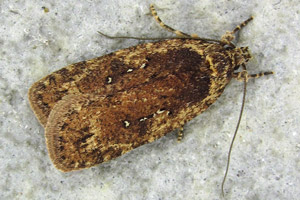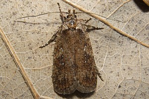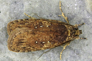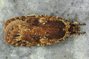 Agonopterix ciliella: Kopf dunkelbraun. Im Bereich der Nahtlinien oft dunkler bis schwarz.
