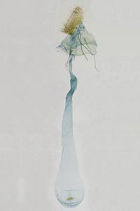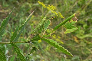 Die Freilandaufnahme zeigt die unterschiedlichen Entwicklungsorte der Raupen an Brustwurz (Angelica sylvestris). Sie leben zuerst an den Blättern der Pflanze, wo sie die Fiederblättchen zu Röllchen einspinnen. Diese Behausungen werden mehrfach gewechselt (1). Gegen Ende der Entwicklung steigen die Raupen in die Blüten- oder Samendolden der Pflanze auf und bauen sich dort ein knäueliges Gespinst (2). Entwickeln sich die Raupen an blütenlosen Pflanzen, so schliessen sie ihre Entwicklung in Gespinsten an den grossen Basisblättern ab. Die Verpuppung erfolgt schliesslich am Boden unter der Pflanze (3).