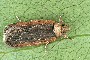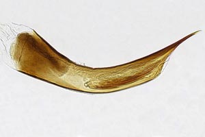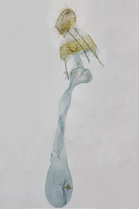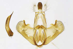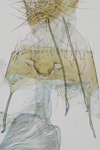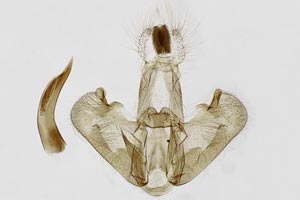 1: 10 mm, noch nicht erwachsen, ♀: Österreich, Niederösterreich, 1,5 km N Schwarzau am Steinfeld, lichtungs- und laubholzreicher Schwarzföhrenforst, leg. Raupe zwischen 2 aufeinandergesponnenen Blättchen von Kleiner Bibernelle (Pimpinella saxifraga) 22. Mai 2008 (Foto: Peter Buchner)Forum