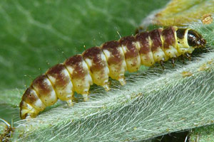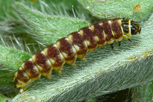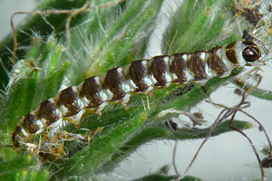 Parsons (1995) fasst für Großbritannien zusammen: "In captivity, eggs are laid singly on or under a leaf or on a stem or flower of viper's bugloss Echium vulgare. The larvae feed on the flowers and unripe seeds, living in a silken gallery spun along the upper side of a shoot, and are completely hidden (Ford 1951). A tenanted shoot is indicated by the flowers and sepals on either side of the gallery being drawn together. When fully fed, the larvae pupate in rotten wood, in dead stems or in detritus (Emmet 1988a)." Sattler (2002) wiederholt diese Angaben mehr oder weniger. Fords (1951) ex-ovo-Zuchtversuch vom 17. Juni 1950 war zunächst nicht sehr erfolgreich, weil die abgeschnittenen Blütenstängel sehr schnell vertrockneten. Aber er konnte die Raupe ja auch dort studieren, wo im Juni zahlreiche Falter geflogen waren (Dungeness area, Great Britain). Ende Juli fand er dort zahlreiche Raupen unterschiedlicher Stadien, die an den Blüten und unreifen Früchten des Natternkopfs fraßen: "The larvae feed on the flowers and unripe seeds of Echium, living in a silken gallery spun upon the upper side of a shoot and are completely hidden." Durch diese versteckte Lebensweise weicht sie stark von anderen Arten der Gattung ab, die als Raupe frei zwischen wenigen Fäden an Echium oder anderen Boraginaceen leben. Nach Ford (1951) waren seine Raupen schon Mitte August verpuppungsreif.