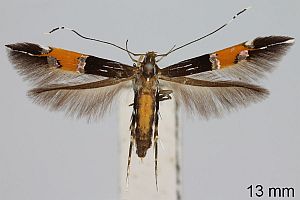 Die Oberfläche des Körpers und der Flügel sehen aus wie dunkelbrauner Samt. Die Spitzen der Fühler und zwei Punkte nahe der Fühlerspitzen sind weiß.