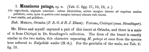 - Erstbeschreibung: Godman, F. D. & O. Salvin (1879-1901): Biologia Centrali-Americana. Insecta. Lepidoptera-Rhopalocera. Vol. III. (Plates.): pl. 1-24, 24a, 25-112. — Digitalisat auf biodiversitylibrary.org: [pl. 100 figs. 17-19]