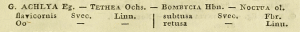- Erstbeschreibung: Billberg, G. J. (1820): Enumeratio insectorum. Explicatio Signaturæ Aucrotum [2 unpag. pp.], 1-138.