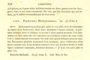 - Erstbeschreibung: Guenée, A. (“1857”) [1858]: Histoire naturelle des Insectes. Species général des lépidoptères 10. Uranides et Phalénites. Tome II: 1-584. Paris (Roret).