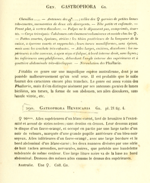 - Erstbeschreibung: Guenée, A. (“1857”) [1858]: Histoire naturelle des Insectes. Species général des lépidoptères 9. Uranides et Phalénites. Tome I: I-LVI, 1-515. Paris (Roret).