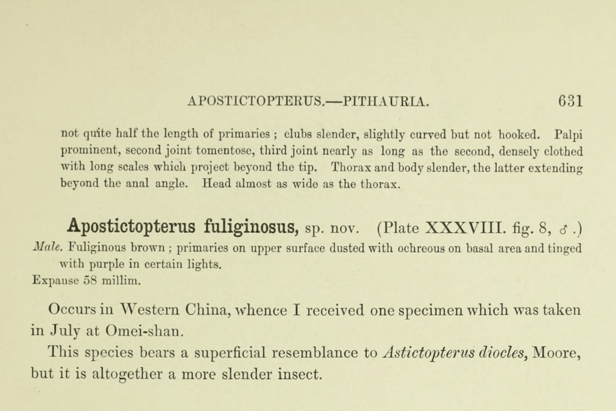- Erstbeschreibung: Leech, J. H. (1893): Butterflies from China, Japan, and Corea. Part V: 557-642, pl. XXXVIII-XLIII. London (R. H. Porter). — Digitalisat auf biodiversitylibrary.org: [630], [pl. XXXVIII fig. 8]