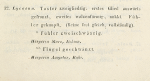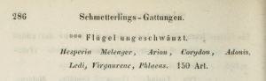 - Neuauflage 1856 der Erstbeschreibung von 1807: Entomologischer Verein Stettin (Hrsg.) (1856): Die neueste Gattungs-Eintheilung der Schmetterlinge aus den Linnéischen Gattungen Papilio und Sphinx. — In: Entomologischer Verein Stettin (Hrsg.) (1856): Magazin für Insektenkunde herausgegeben von Karl Illiger. Sechster Band. Unveränderter Abdruck: 277-295. Stettin (F. Hessenland).