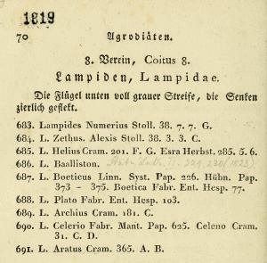 - Erstbeschreibung: Hübner, J. [1816-1826] („1816“): Verzeichniß bekannter Schmettlinge [sic]: 1-431, 1-72. Augsburg.