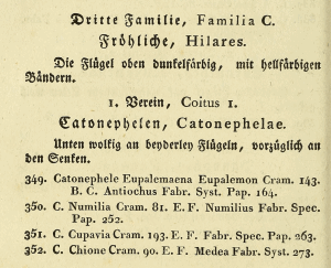 - Erstbeschreibung: Hübner, J. [1816-1826] („1816“): Verzeichniß bekannter Schmettlinge [sic]: 1-431, 1-72. Augsburg.