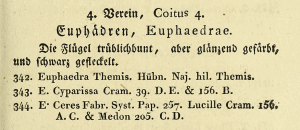 - Erstbeschreibung: Hübner, J. [1816-1826] („1816“): Verzeichniß bekannter Schmettlinge [sic]: 1-431, 1-72. Augsburg.
