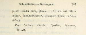 - Neuauflage 1856 der Erstbeschreibung von 1807: Entomologischer Verein Stettin (Hrsg.) (1856): Die neueste Gattungs-Eintheilung der Schmetterlinge aus den Linnéischen Gattungen Papilio und Sphinx. — In: Entomologischer Verein Stettin (Hrsg.) (1856): Magazin für Insektenkunde herausgegeben von Karl Illiger. Sechster Band. Unveränderter Abdruck: 277-295. Stettin (F. Hessenland).